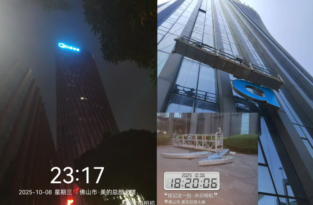 工程啟動之初,三大核心難題便擺在面前:其一,時間極緊 —— 需在 2025 年 10 月 1 日至8日美的員工國慶休假期間完成全部施工,8天時間要覆蓋拆除、安裝、調試全流程,容不得絲毫延誤;其二,環境復雜---美的總部大廈外立面為曲線型設計,玻璃幕墻的弧形結構對發光字的貼合度、安裝精度提出嚴苛要求;其三,天氣多變---施工期間臺風頻發,極端天氣不僅威脅高空作業安全,更可能直接打亂施工節奏。?